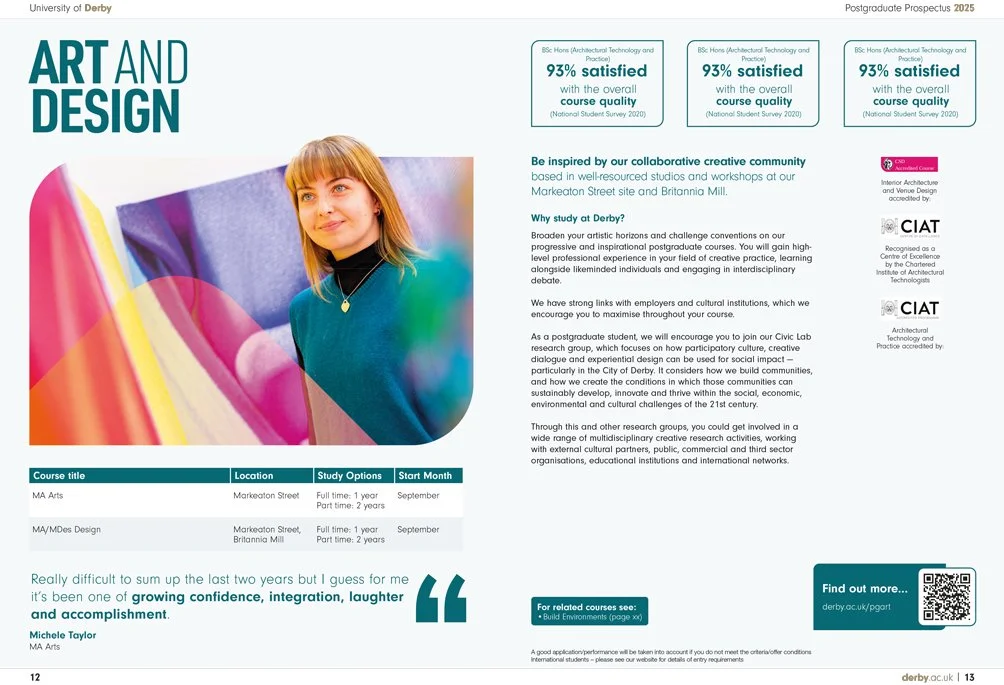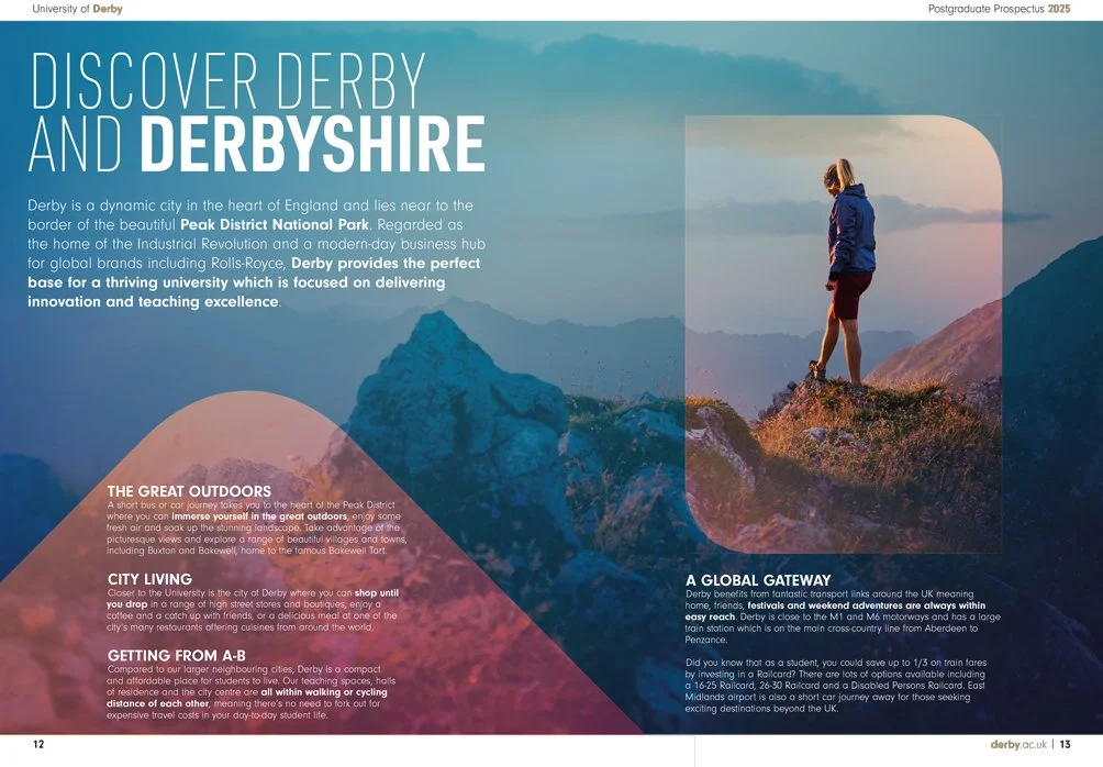 One of the University of Derby’s most critical recruitment tools, the Postgraduate Prospectus and wider branding have to communicate complex academic content to a diverse audience ranging from recent graduates to experienced professionals.